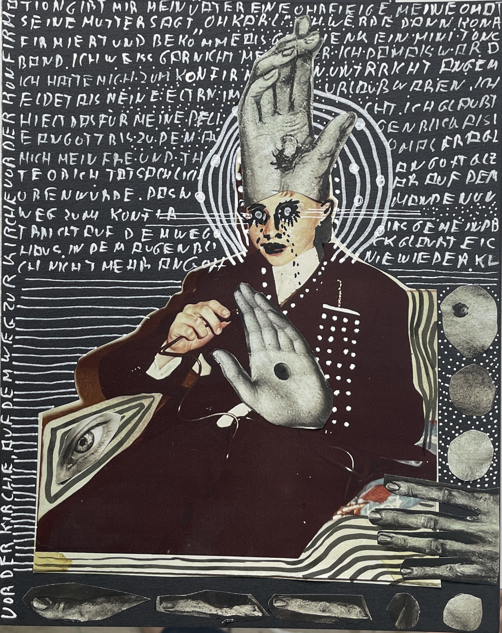 crylic pen and ink on black paper, family photo, collaged elements from paintings with the stigmata of Jesus, DIN A5, Sept. 25